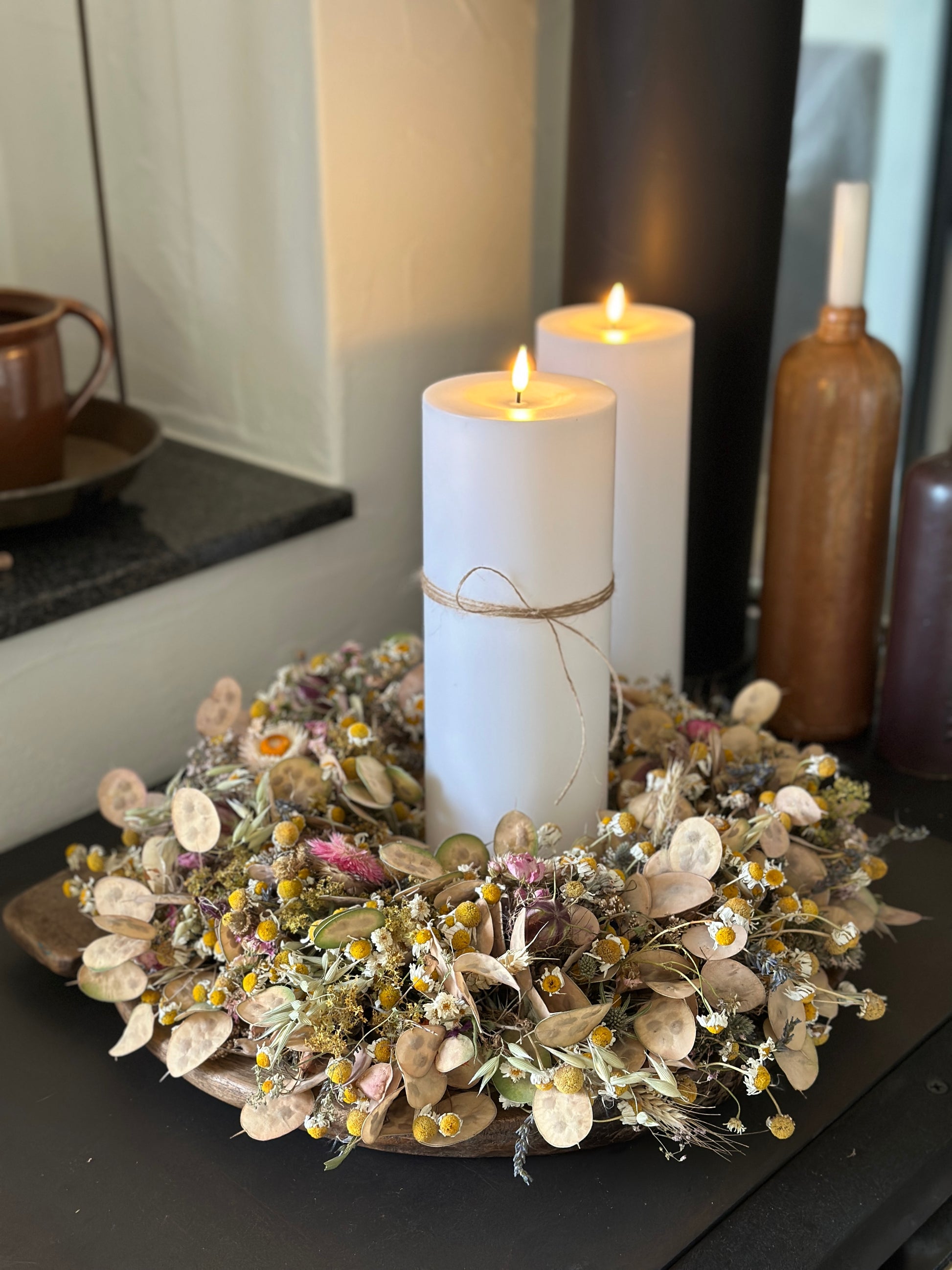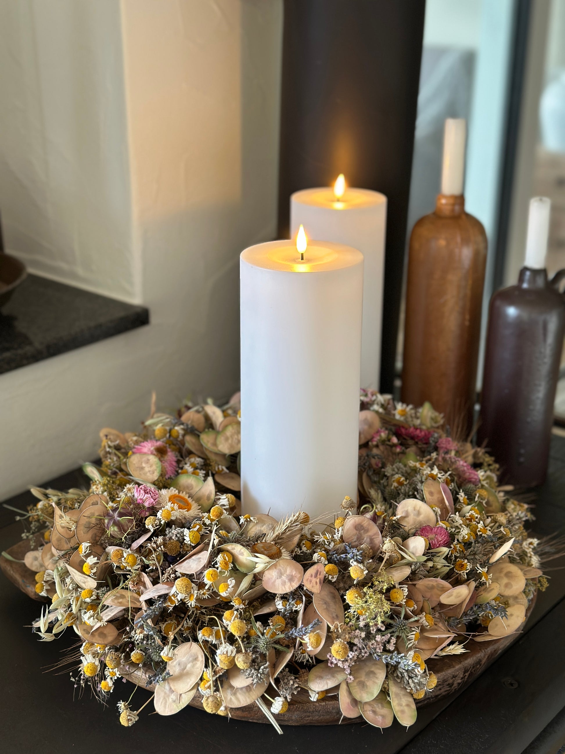 Kerze weiß für innen und außen geeignet, inklusive Timerfunktion für 6/18 Stunden.