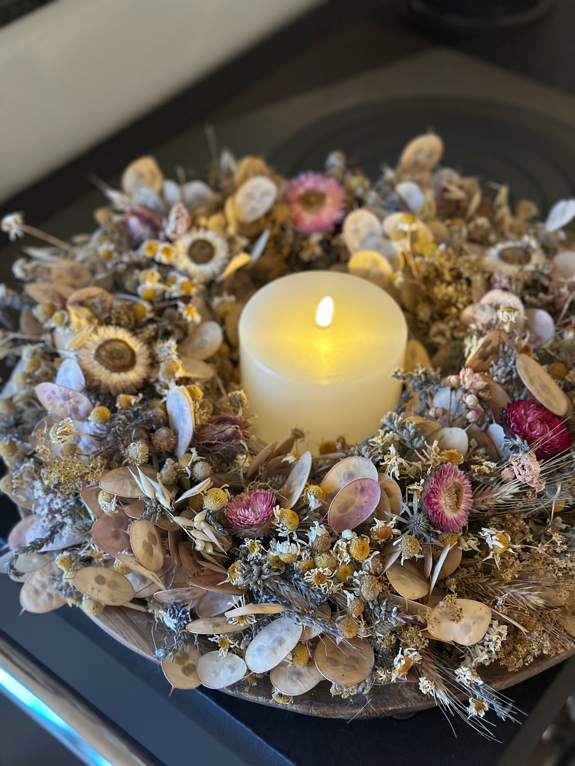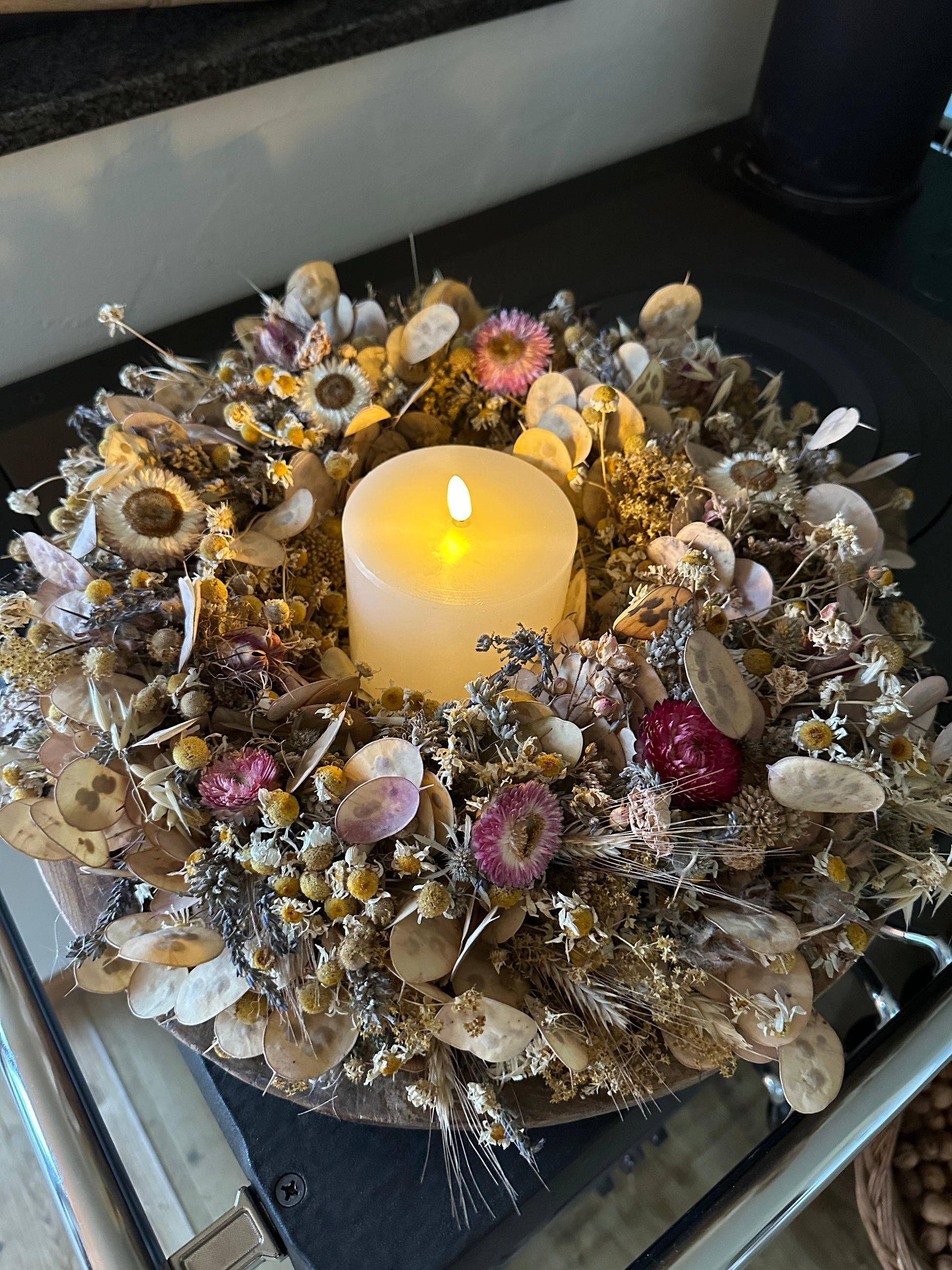 Ohne Kerze. Kranz auf einer Unterlage mit einem Draht gebunden. Lavendel, Kamile, Strohblumen, Getreide, Frauenmantel.