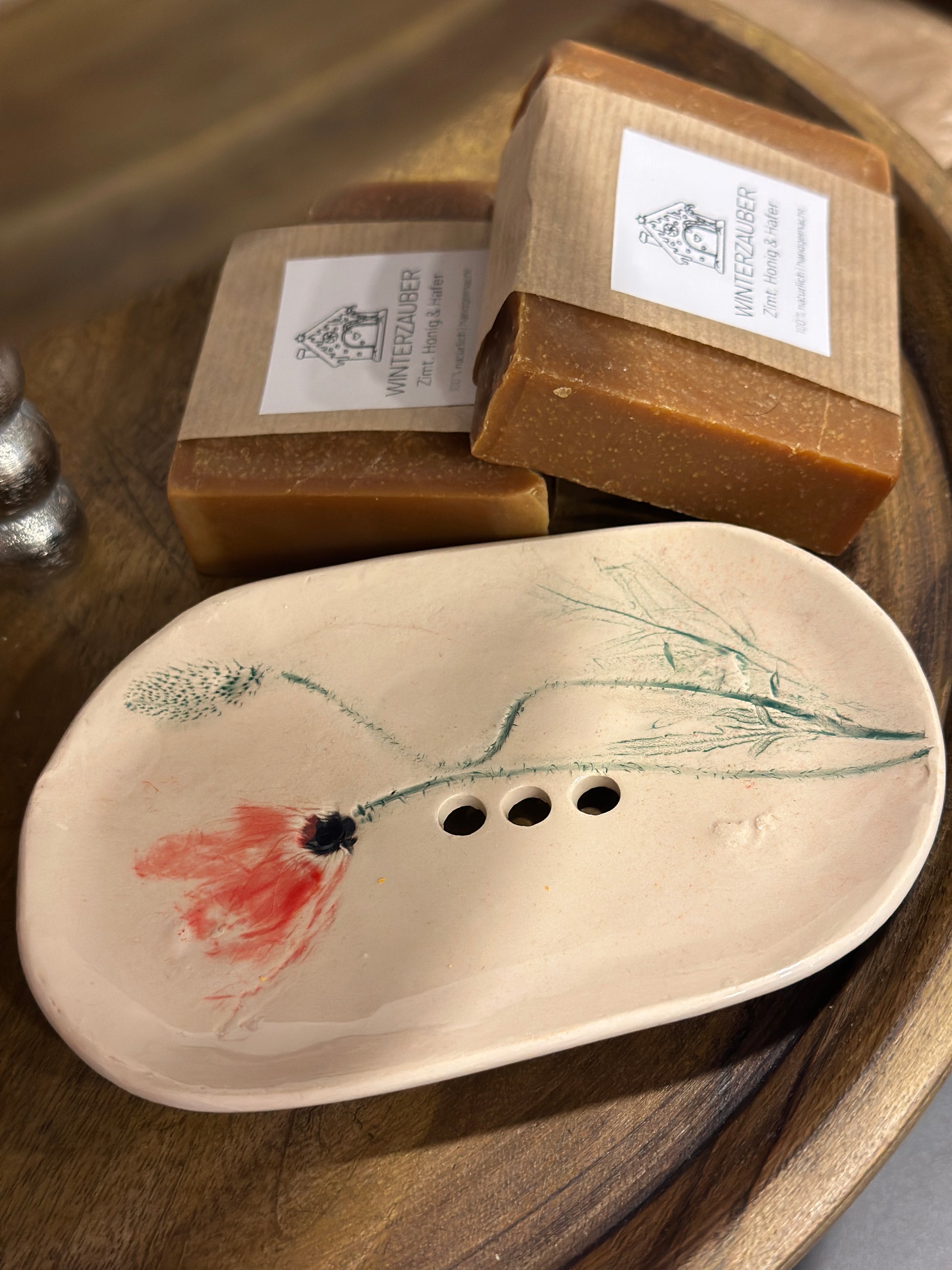 Seifenschale- Mohnblume mit echtem Blüten-/ Blattabdruck, Spülmaschinenfest. Mit Füßchen&Löchern